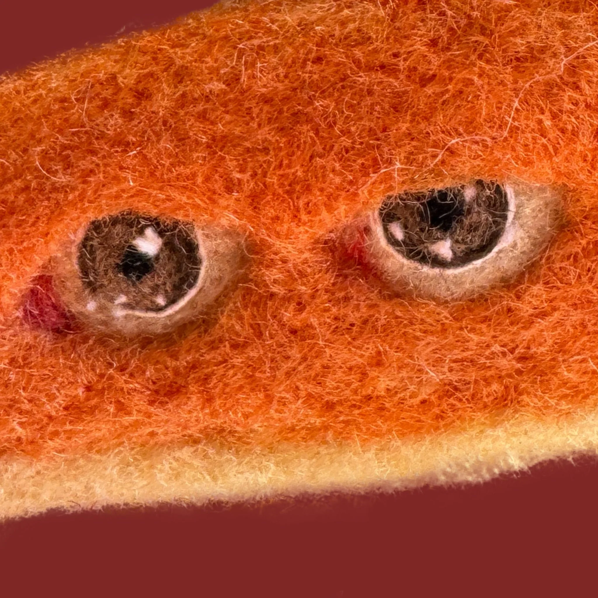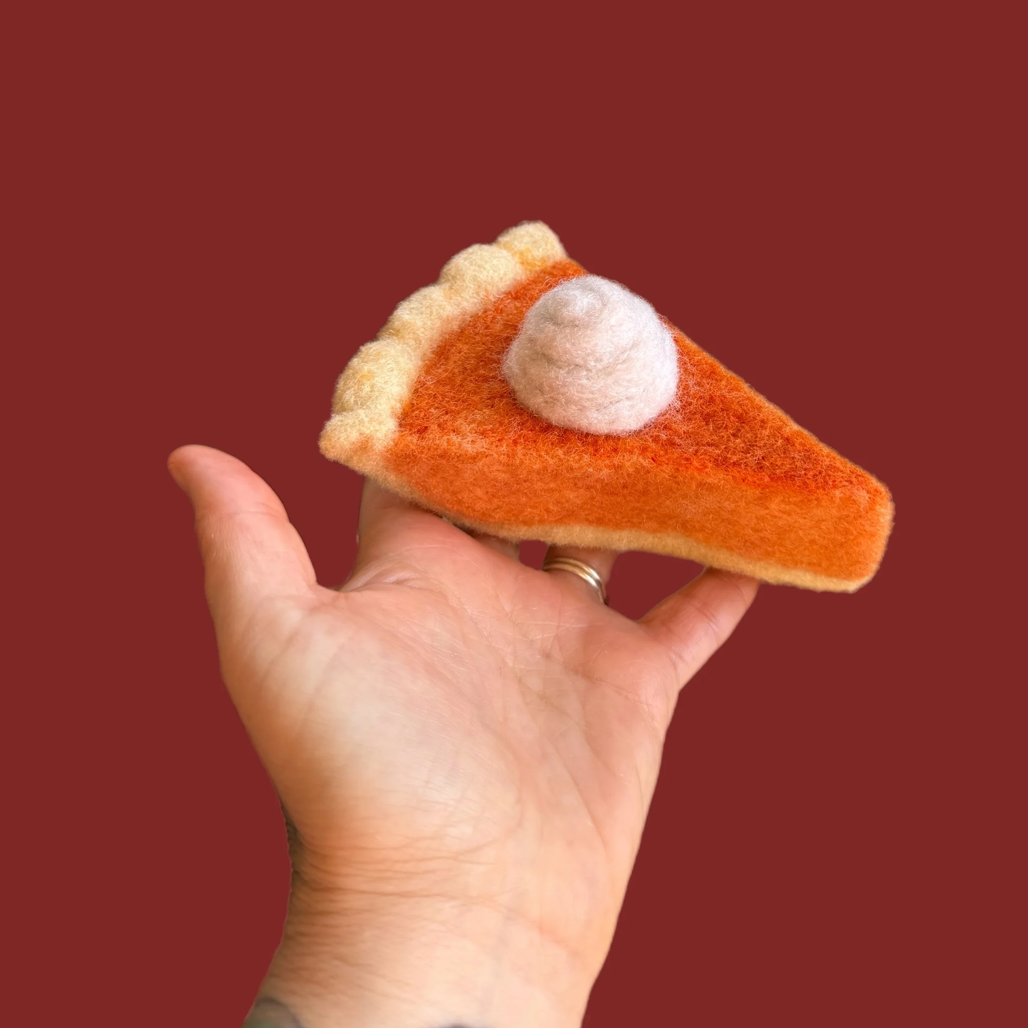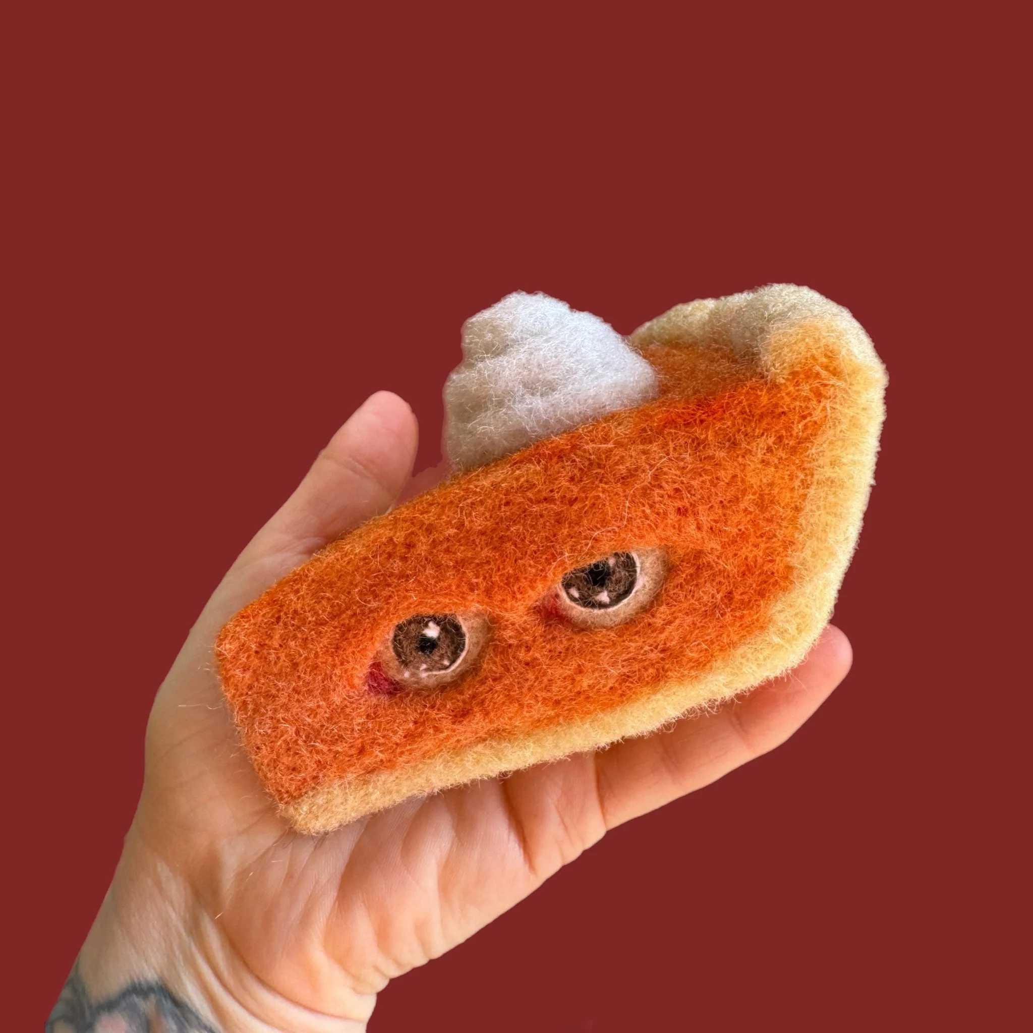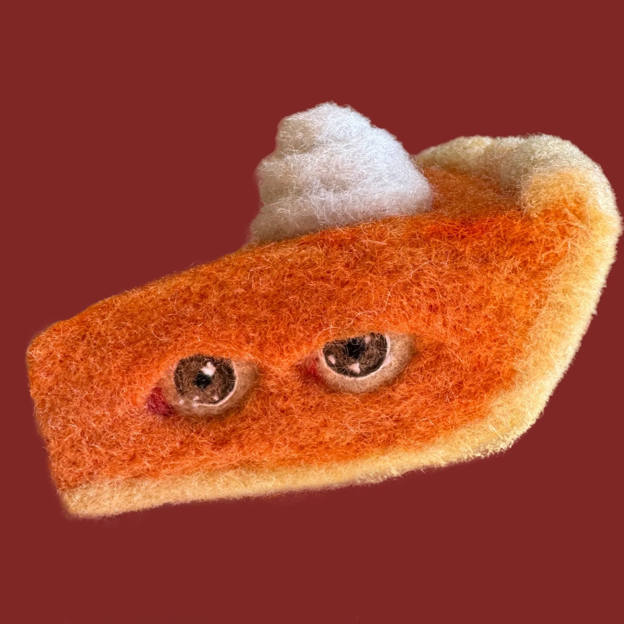 TOTALLY NORMAL PIE WITH WHIPPED CREAM 8 is a needle felted soft sculpture made from hand dyed polyester fiber and wool. Approximately 5in x3.75in x 1.75in )all measurements are from widest points). This is a free standing sculpture. Ships in five business days.