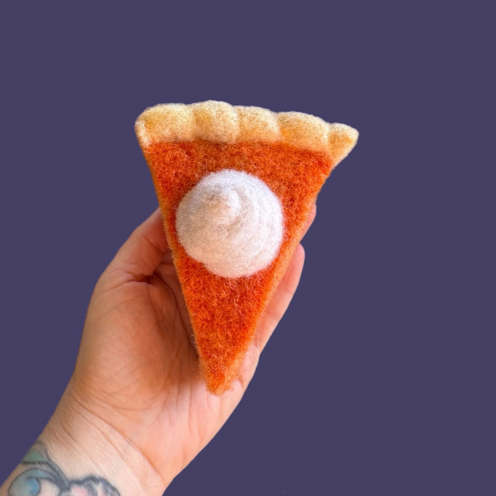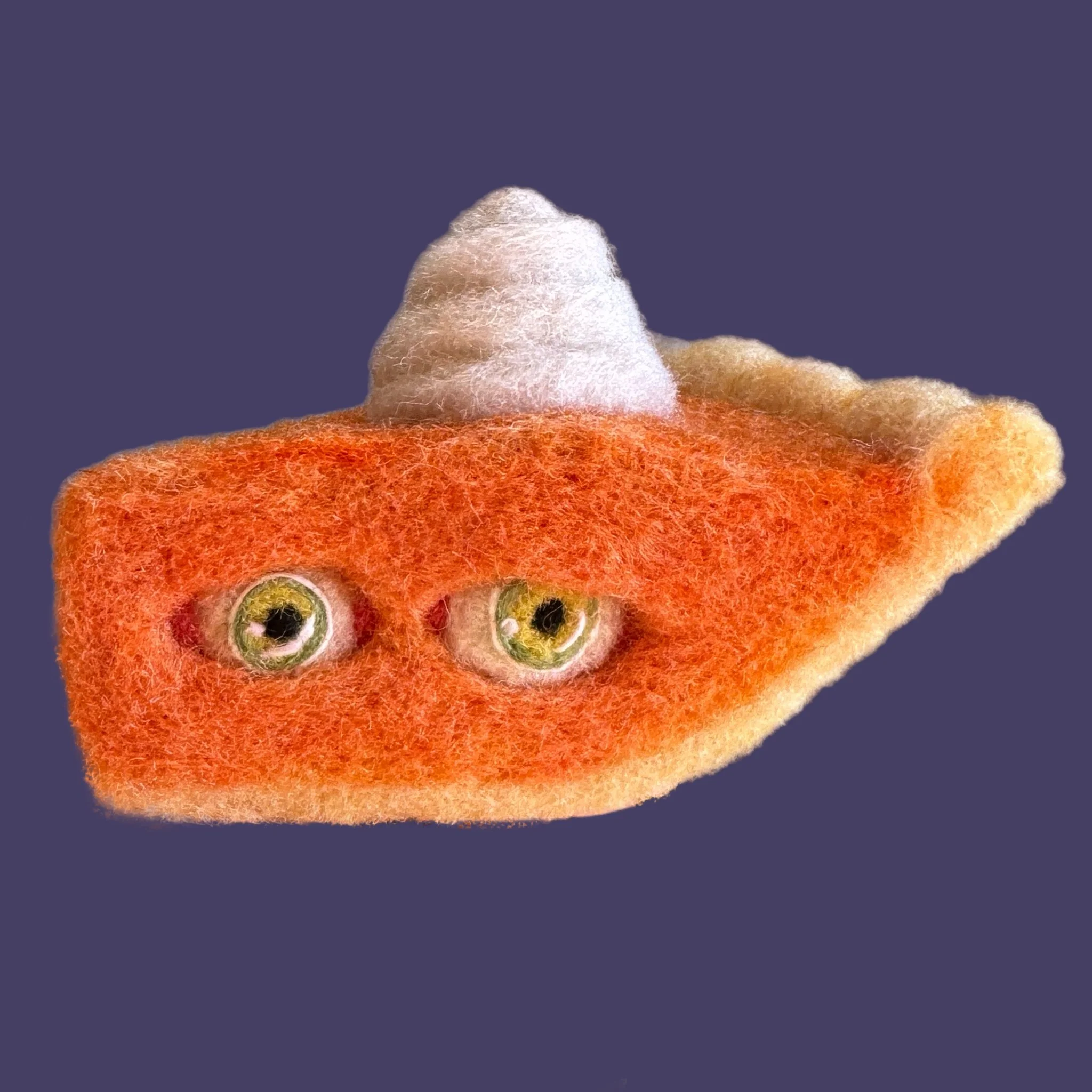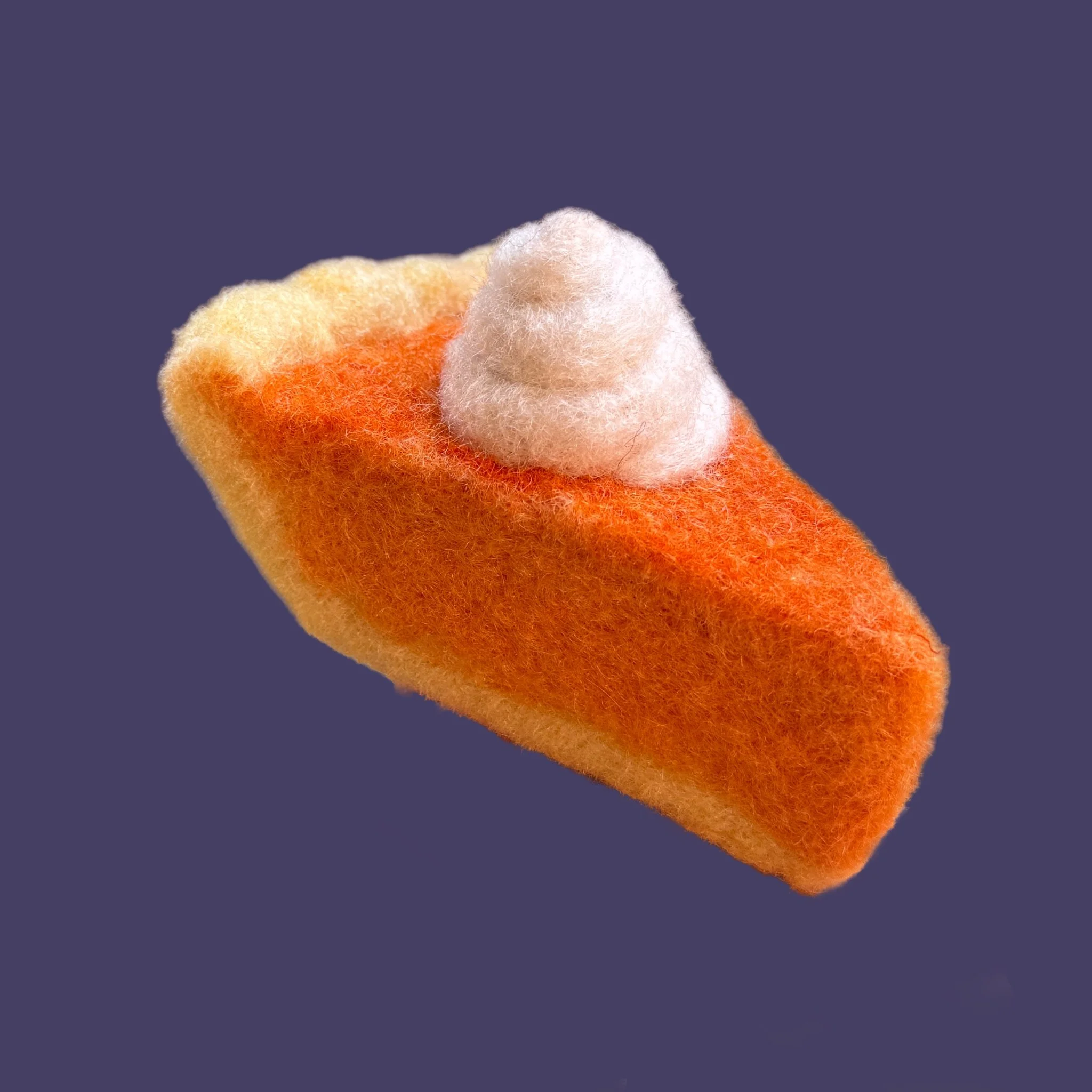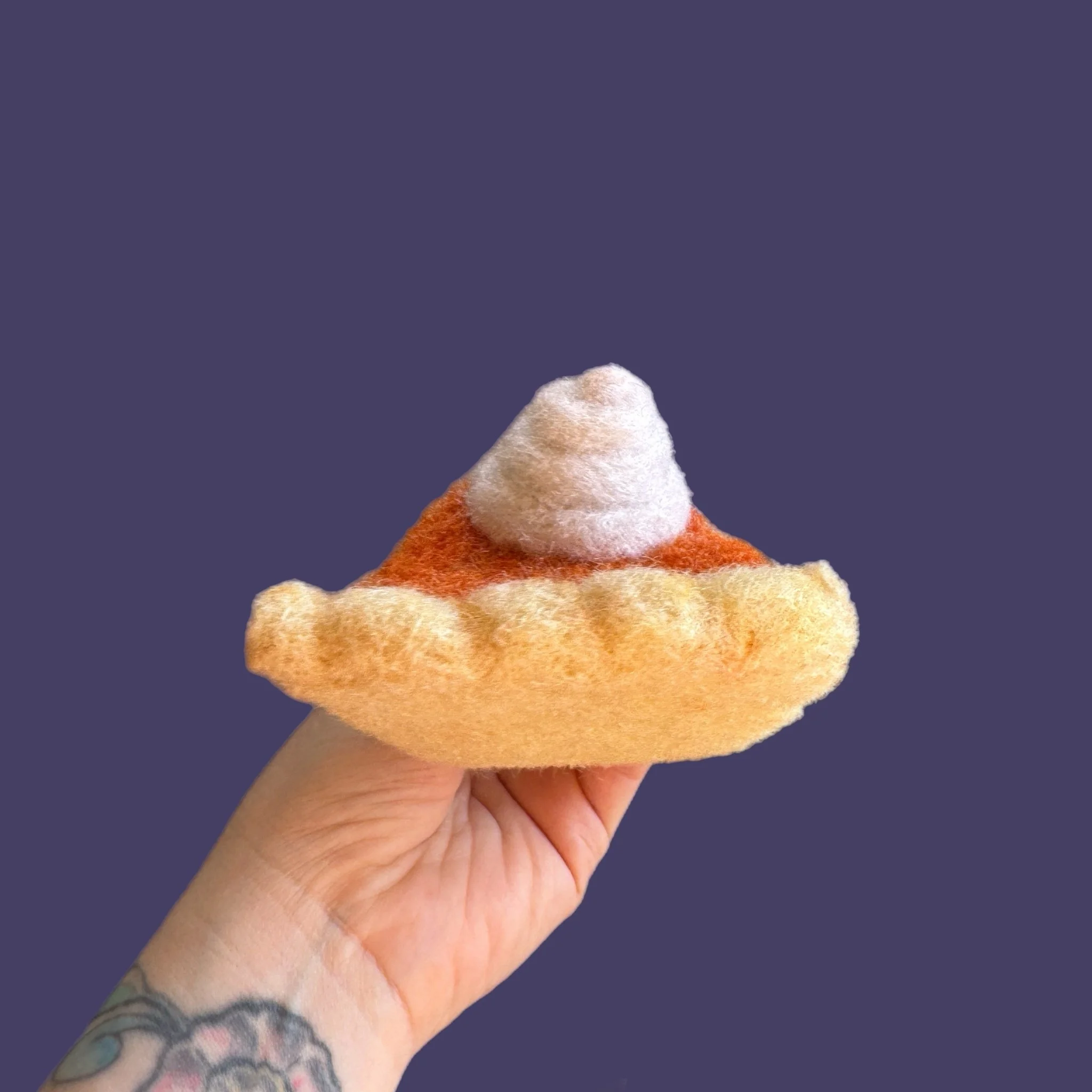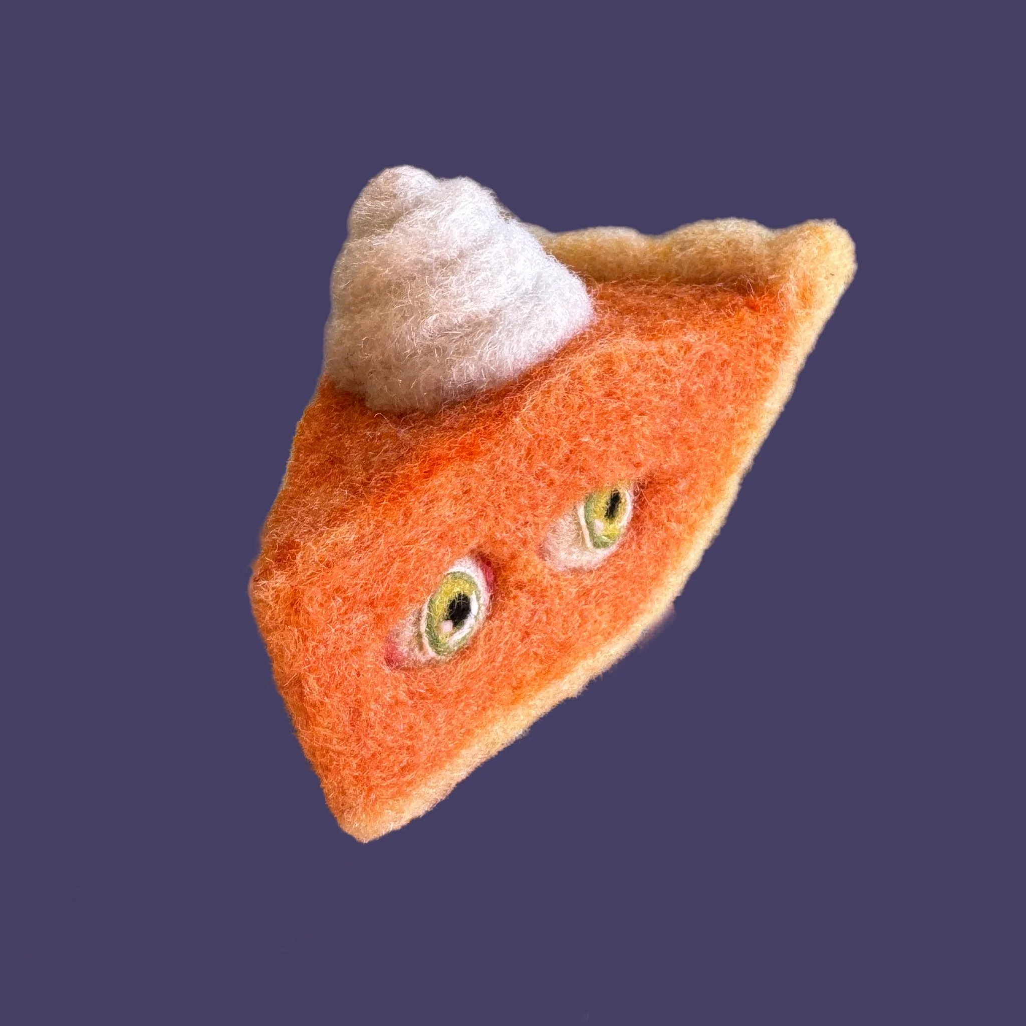 TOTALLY NORMAL PIE WITH WHIPPED CREAM 3 is a needle felted soft sculpture made from hand dyed polyester fiber and wool. Approximately 5in x3.75in x 1.75in )all measurements are from widest points). This is a free standing sculpture. Ships in five business days.